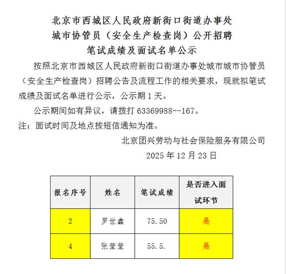 北京市西城区人民政府新街口街道办事处城市协管员(安全生产检查岗)公开招聘笔试成绩及面试名单公示