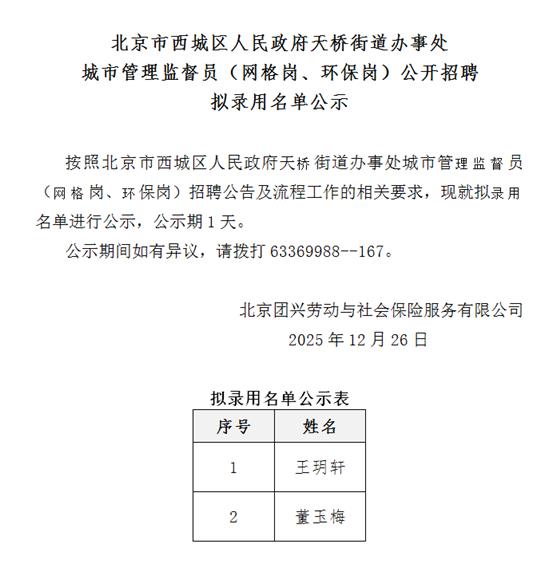 北京市西城区人民政府天桥街道办事处城市管理监督员(网格岗、环保岗)公开招聘拟录用名单公示